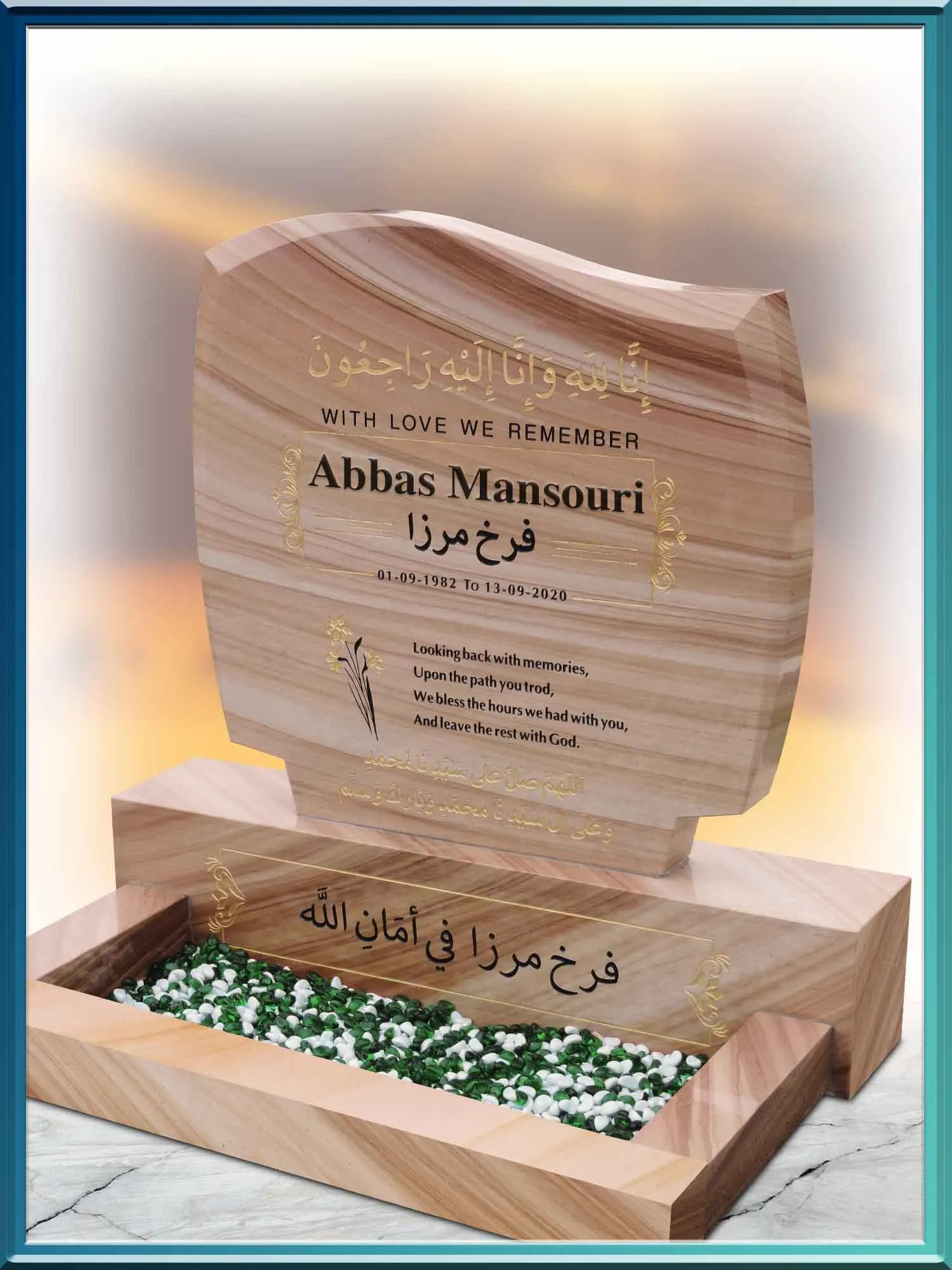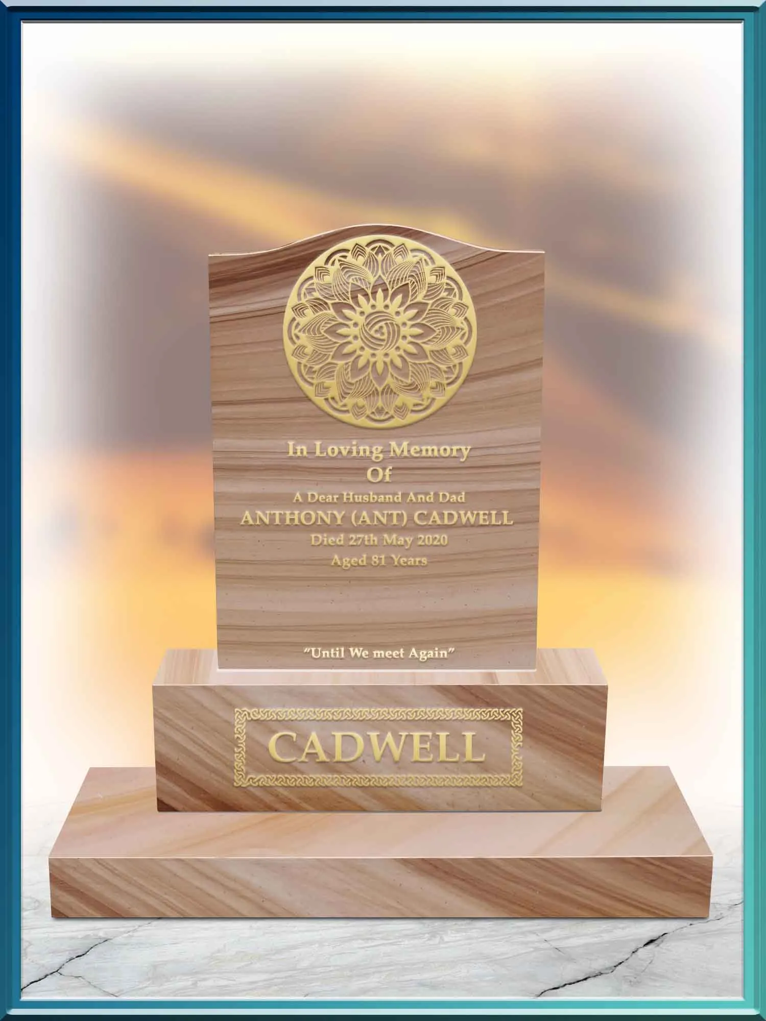 This was our inspiration and philosophy behind our choice. Sahara Gold. Few people would interpret this granite as anything other than striking and captivating. Balgriffin Headstones latest marble addition exclusively sourced and extracted from India has all the essential qualities of an exquisite and sought after material worthy to stand alongside all the other individual marbles and granites in our beautiful range. It is a brand-new marble and does not replace any other marble that went before it. Balgriffin Headstones first-ever horizontal patterned natural stone with multiple tones of warm golds and peaches makes its presence felt with its own identity. When used with a stunning memorial design such as an “Abstract Wave Celtic Cross” memorial as shown above, both memorial and natural stone marble together become a masterpiece of refined proportion.
